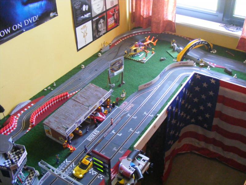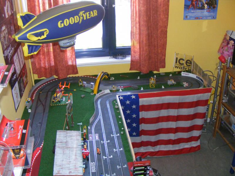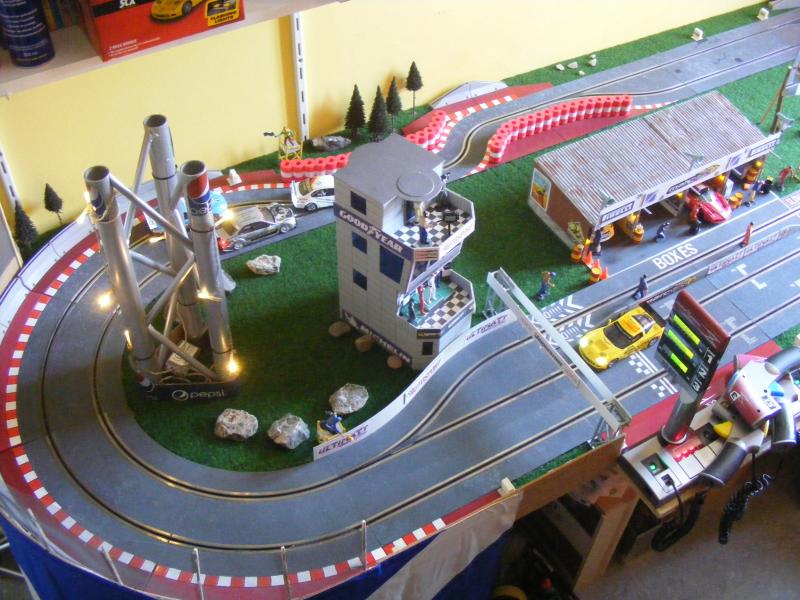 Voilà enfin, après 7 mois de boulot, un résultat qui me plaît. Bien entendu, le tracé, les bâtiments, l"ensemble ne va pas plaire à certains. Normal, un style de tracé n'est pas l'autre. Mais la contrainte était de taille : vivant en appartement, une seule partie de pièce pouvait être consacrée à mon circuit. Je dispose d'un espace de 2,70 sur 1,50 en L. Avec une piste au 1/32, et mes propres exigences (une épingle, une chicane) il a fallu batailler avec le tracé pour trouver un compromis.