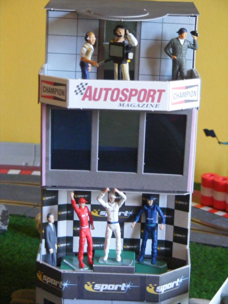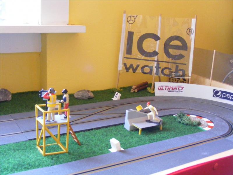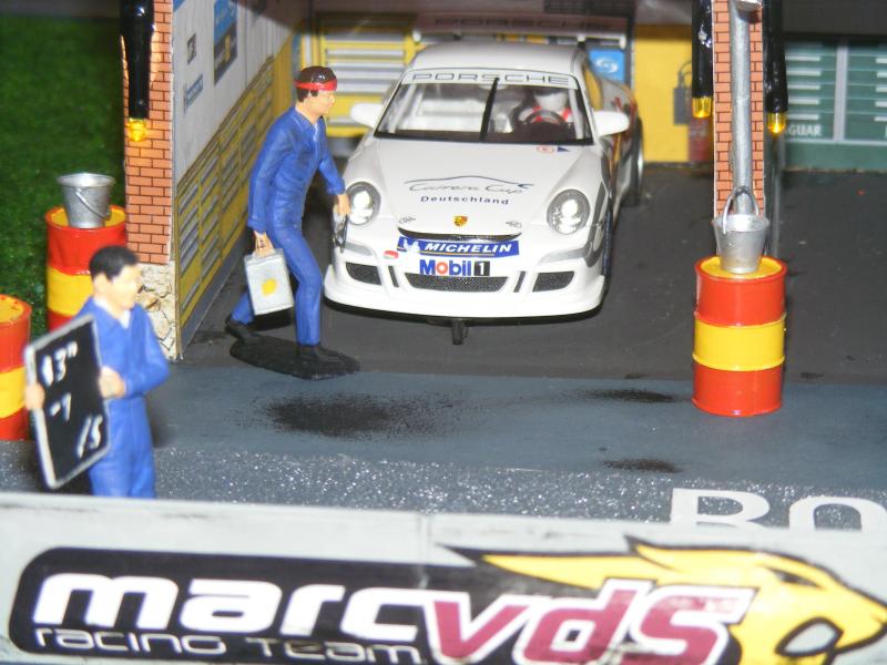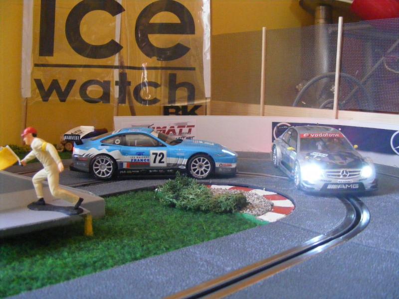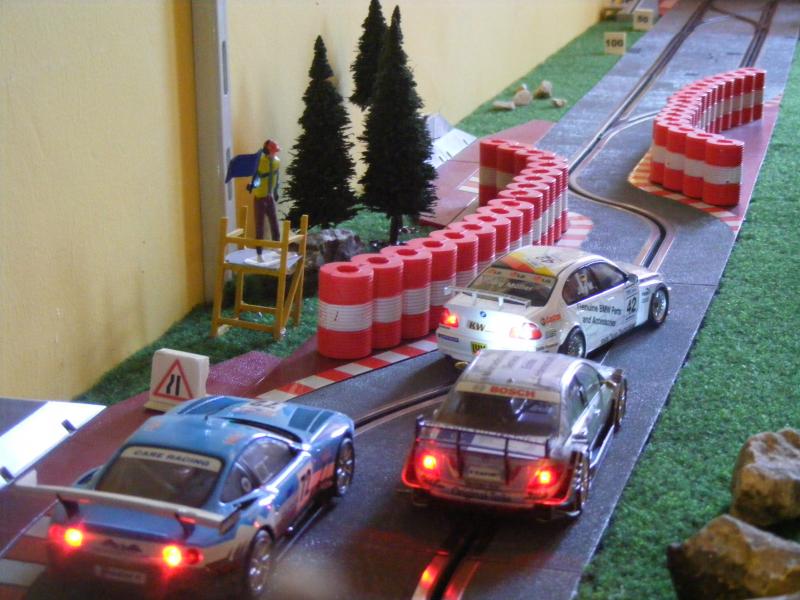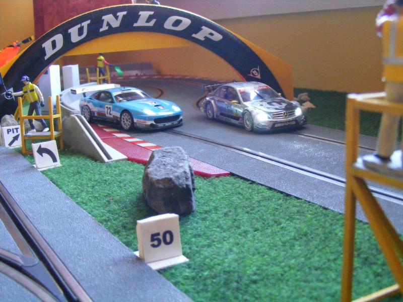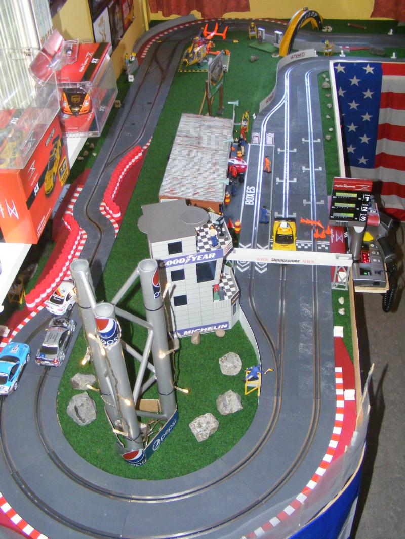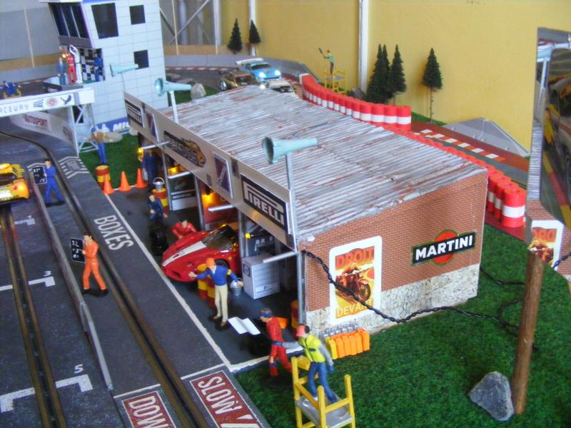 Pour les décors, c'est soft. De la moquette de jardin pour une épaisseur correcte, des cailloux ramassés lors de promenades, des arbres au HO pour l'instant, un hélico Revell au 1/32, une tour de contrôle en carton de chez Scalextric, les garages du pit stop fait maison, les hauts parleurs des otoscopes de mon ORL...... Passons aux images, pour la vue d'ensemble je n'ai pas assez de recul....Mille excuses !