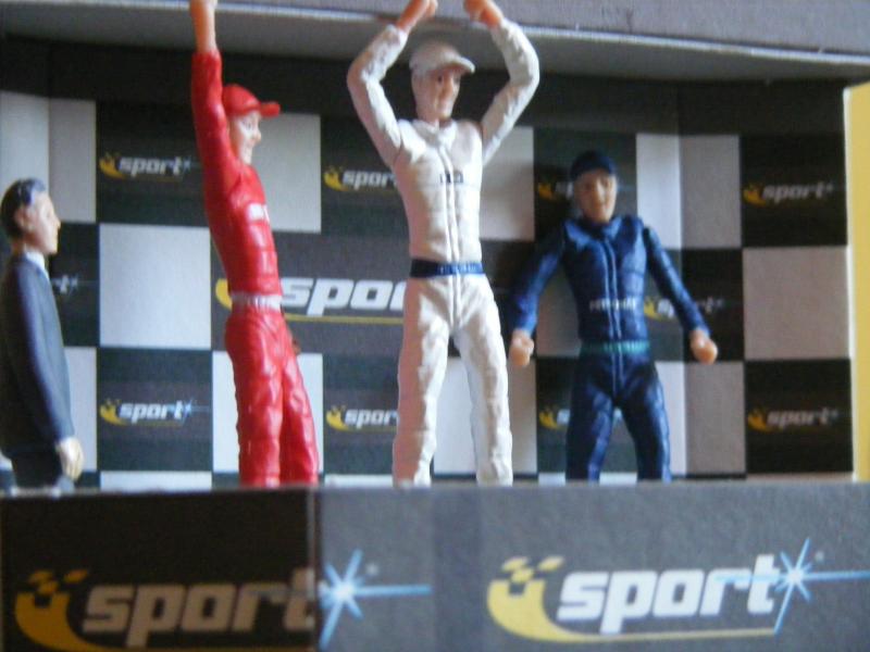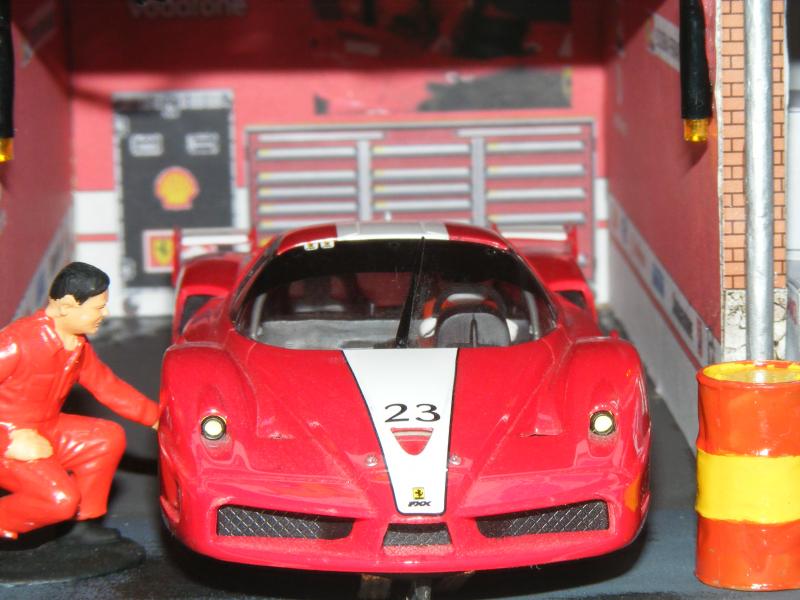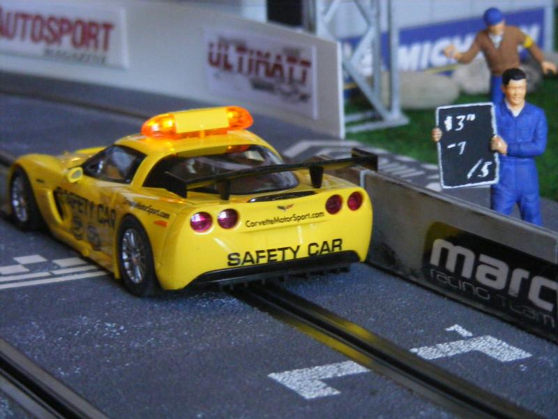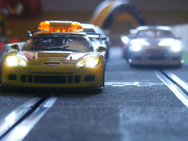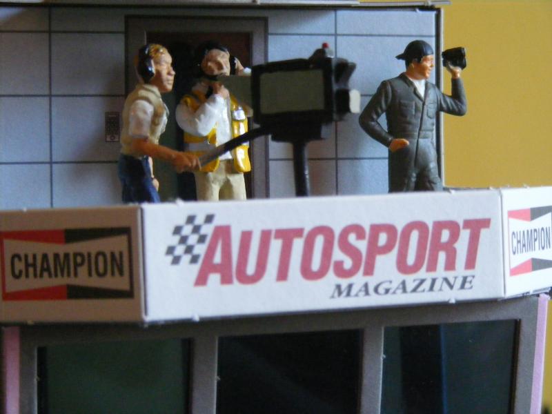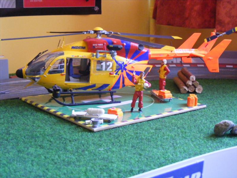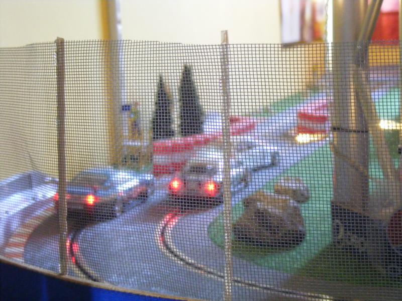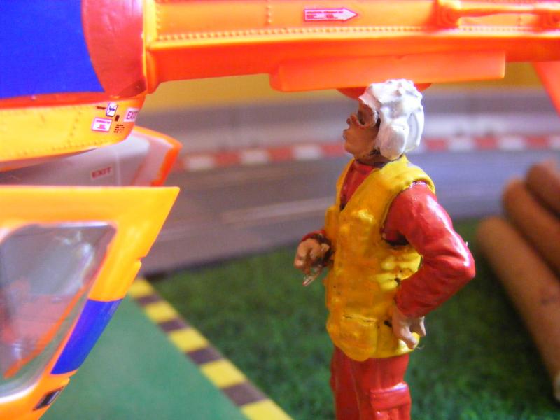 Pour les décors, c'est soft. De la moquette de jardin pour une épaisseur correcte, des cailloux ramassés lors de promenades, des arbres au HO pour l'instant, un hélico Revell au 1/32, une tour de contrôle en carton de chez Scalextric, les garages du pit stop fait maison, les hauts parleurs des otoscopes de mon ORL...... Passons aux images, pour la vue d'ensemble je n'ai pas assez de recul....Mille excuses !