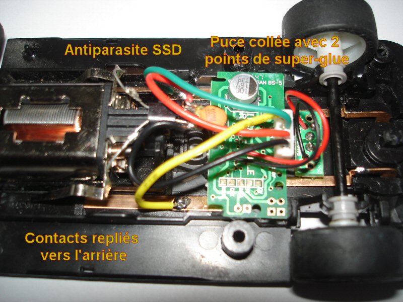 - le remplacement de l'antiparasite (le truc orange qui se "plug" sur le moteur) par celui fourni dans la boiboite de la pupuce Scalextric