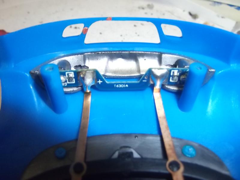 La platine avant: le plus et le moins sont repérés. Si ce n'est pas le cas, le plus est toujours à droite voiture posée sur la piste....donc à gauche carosserie retournée, ce qui est plus pratique pour travailler !