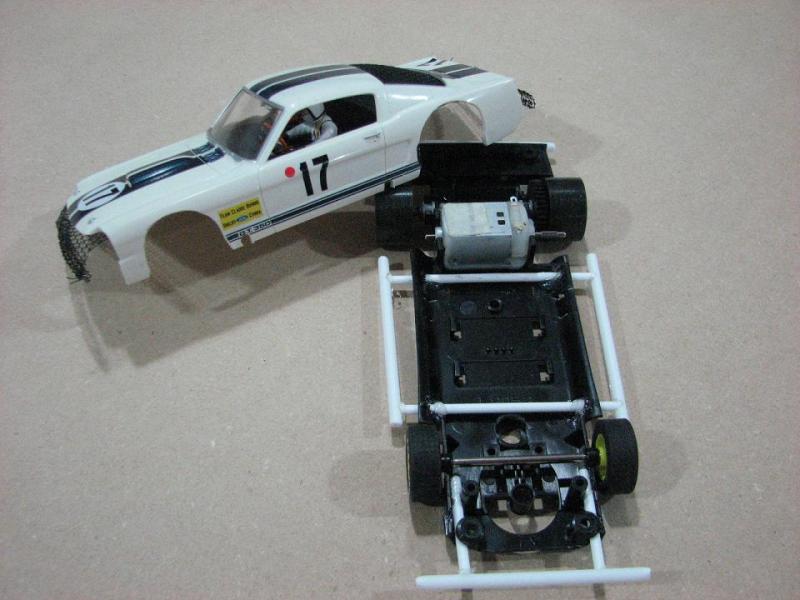 Comment rendre trois voitures ordinaire plus intéressantes... Simple ont les transformes en BOMBER Ici je prend une Mustang Revell je la démolie et garde juste la carrosserie moin les pièces inutiles. Je prend un chassi scalextric de camaro et ajoute des tubes pour solidifier et donner un petit look dirt racing... ajout de grillages...abaissement de la carrosserie en coupant espace pour les pneus...méchante bagnole...