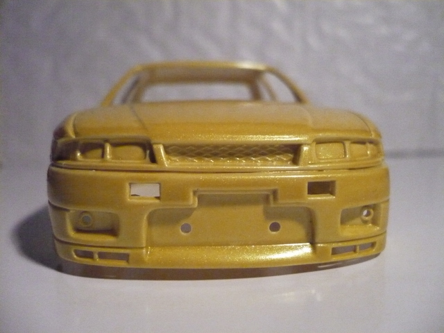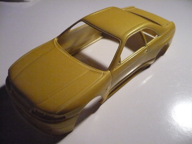 voila je voudrais me lancer ds un scratch avec pour carosserie une maquette de nissan skyline r33 de 1995 de chez ARII donc pour l'instant je l'ai faite peindre en jaune "lamborghini" (gallardo, murcielago...) et je souhaiterais donner un style assez simple comme une prepa nismo ou qqchoz kom ca...