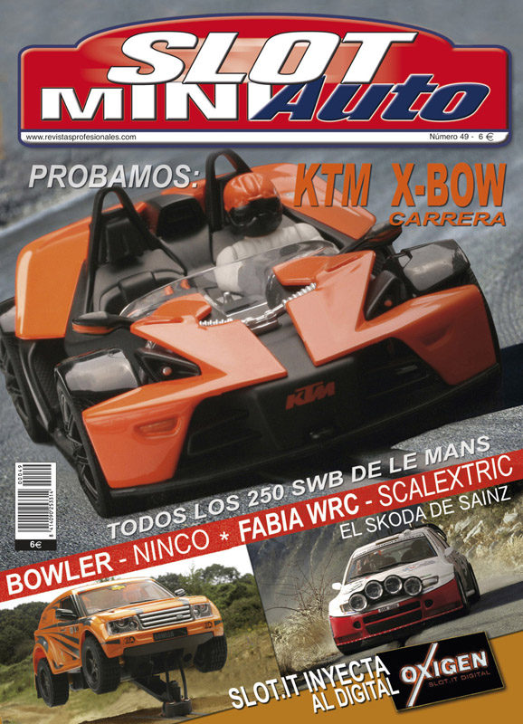 En couverture, la KTM X-Bow de Carrera, un spectaculaire modèle de la marque allemande. A découvrir aussi les essais du nouveau modèle de la gamme Raid de Ninco, le Bowler, de la Skoda Fabia WRC de SCX, et de la dernière voiture de Rallye de Carlos Sainz.
