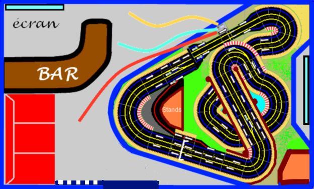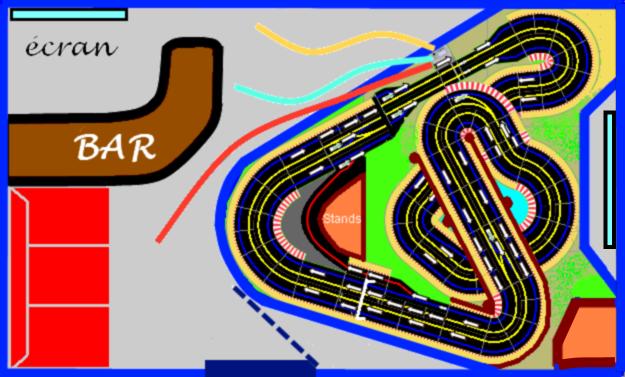 Je n'ai pas trop de commentaire sur le tracé lui même mais par contre je ne trouve l'aménagement de ta pièce très "pratique" : le passage étroit pour entrer, la disposition du bar qui géne aussi, l'écran de controle dans le dos des joueurs, le rammassage aussi. le canapé est il indispensable ? Des tabourets de bar peuvent peut être suffire. Je verais bien un coin prépa et exposition plutôt !