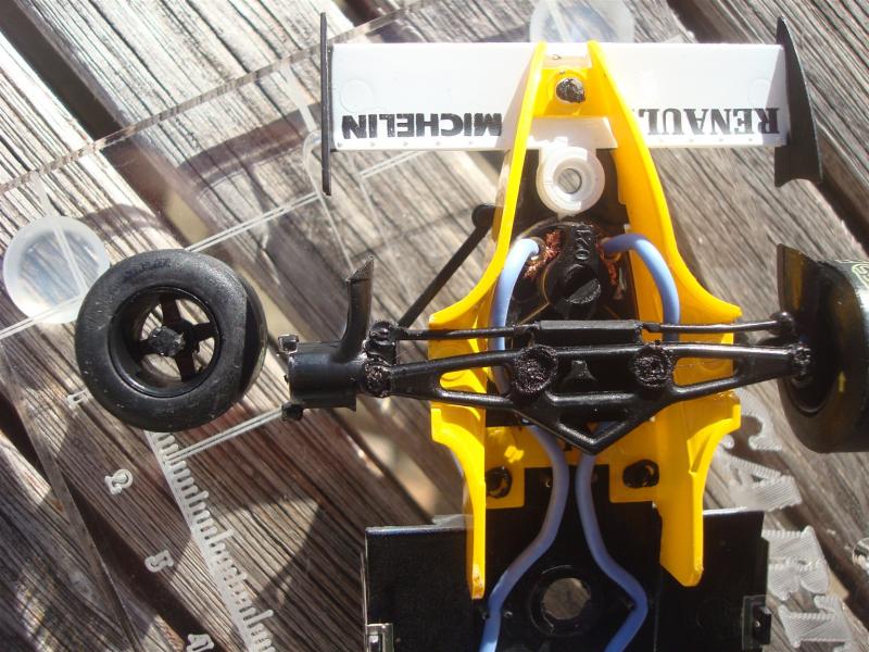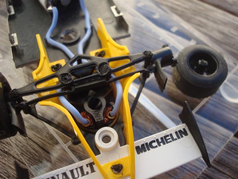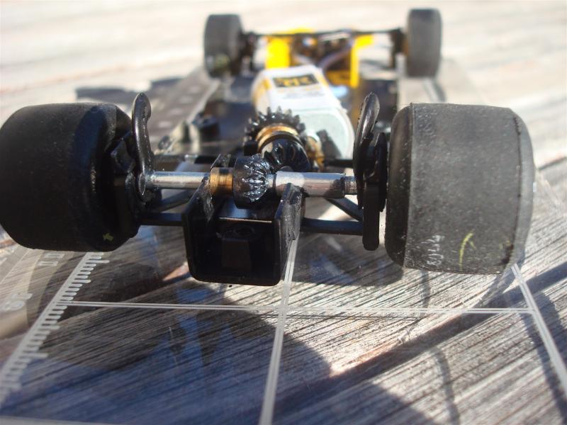 L'axe arrière de ma RS10 n'est pas libre ça accroche. Je vais donc faire ce que j'ai fait avec la Williams FW 07 de Fly. Tout remettre en ligne avec une transmission qui sera libre. Je vais sans doute pour cela me servir de l'arrière d'un châssis lotus 78 Fly. Je vais être obligé de couper une partie de carro supérieure du moteur pour que la couronne passe mais ce ne sera pas dramatique sauf quand on aura le nez dessus. Mais au moins ça roulera nickel comme les autres de la grille F1 75-79. Elles roulent toutes de façon agréable sans être scotchées à la piste par une aimantation sortie de boite ridicule. D'autre part en cas de pignon ou couronne usé ce ne sera pas la galère pour trouver les pièces de rechange d'une RS10 ou Williams FW07.
