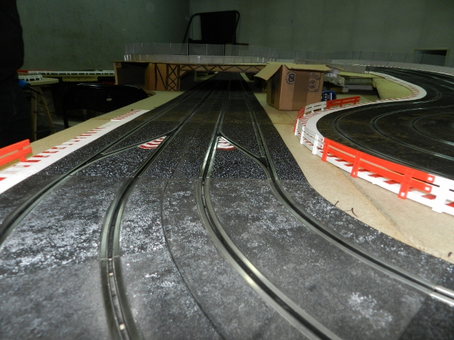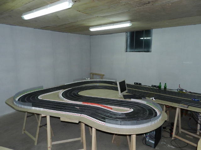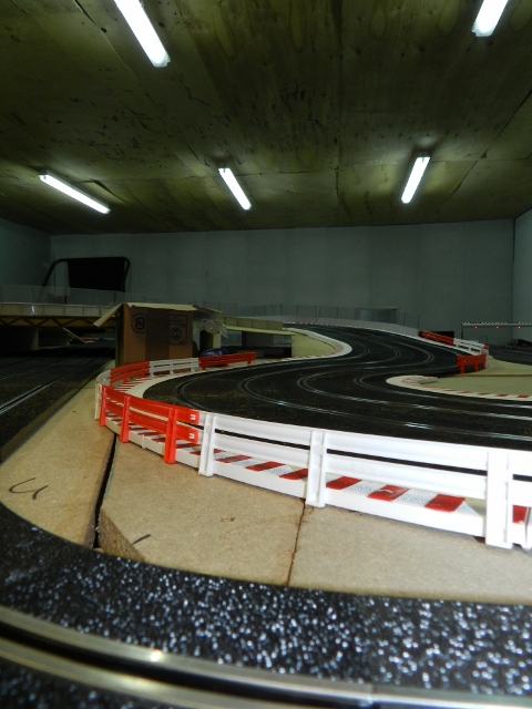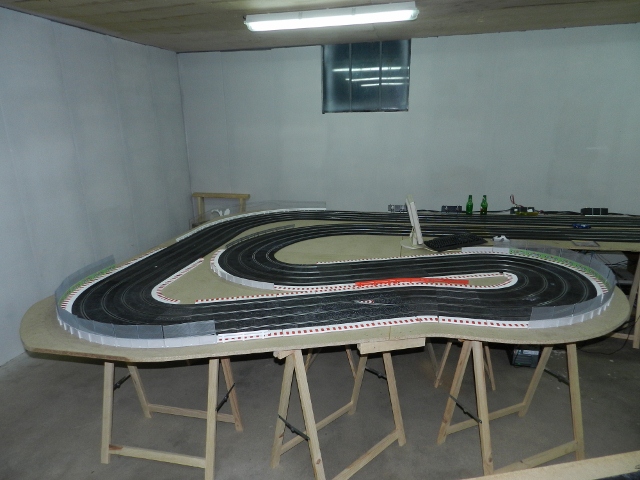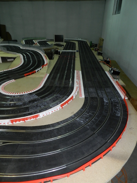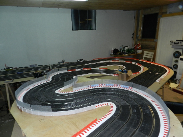 Reste plus qu'à mettre un chrono pour pouvoir vraiment s'amuser, un pit lane et un second multi-lane qui devraient arriver le mois prochain, j'espére et 2 aiguillages en croix. Quelques tours ont été chronométrés avec la passerelle ds et le meilleur est descendu en 15s54 ou 15s64, je ne sais plus.