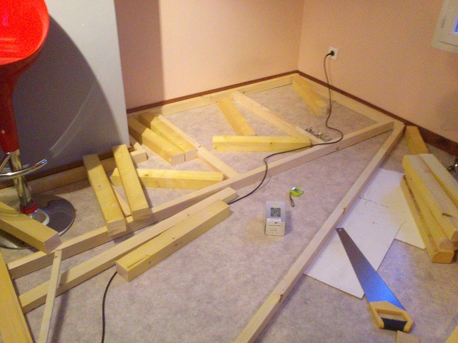 J'ai réalisé le quadrillage de la table avec des demi-chevrons (60/40) et les pieds avec des chevrons (60/80) de façon à faire un planché solide pour marcher dessus sans craintes.