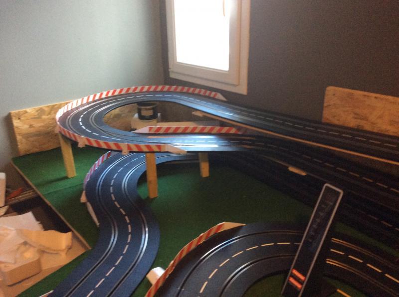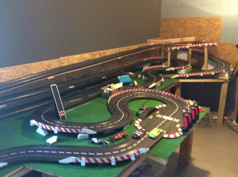 Petit à petit j'en suis venu à installer un circuit fixe au garage, 22 m de pistes en carrera D132. Pas encore de déco et quelques modifications de tracé à faire (une petite photo en bas du message, j'en mettrais d'autres dans la section qui le fait bien).