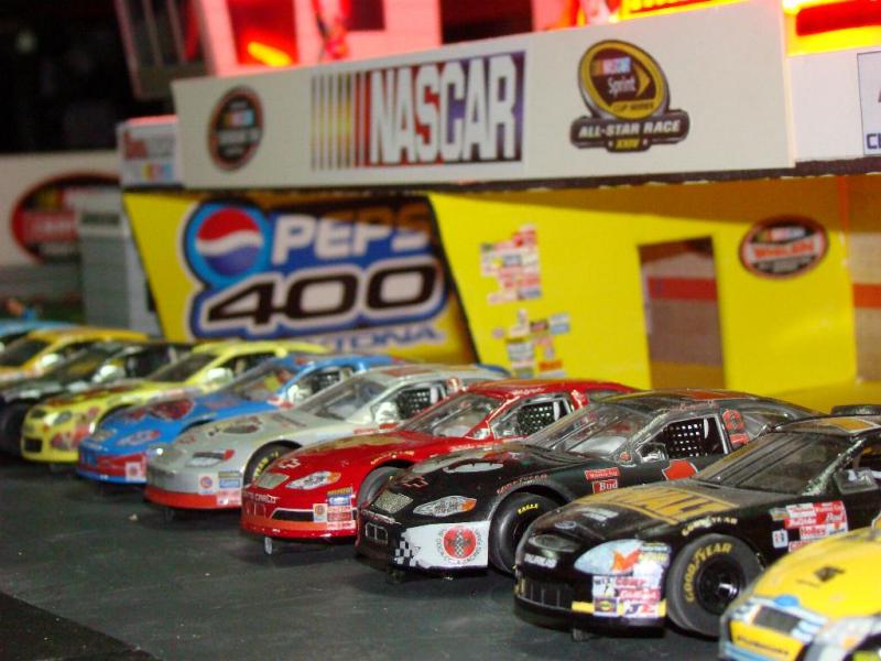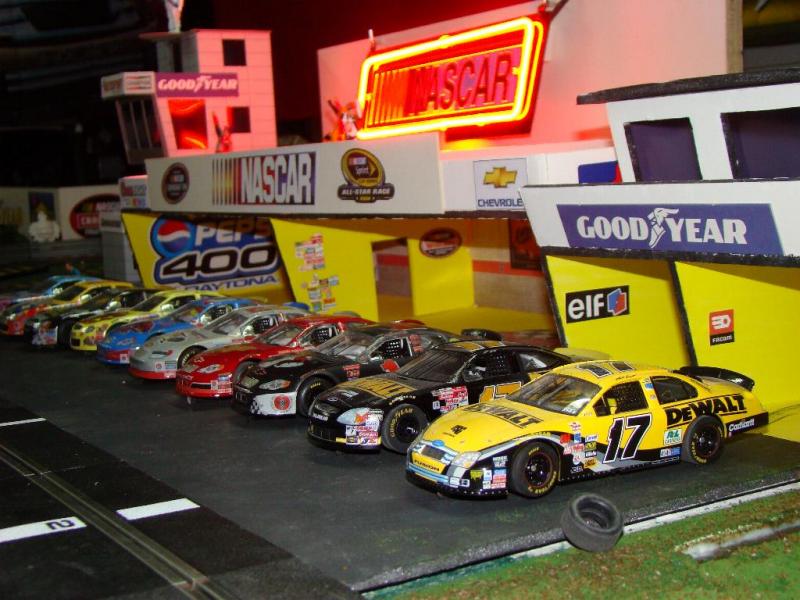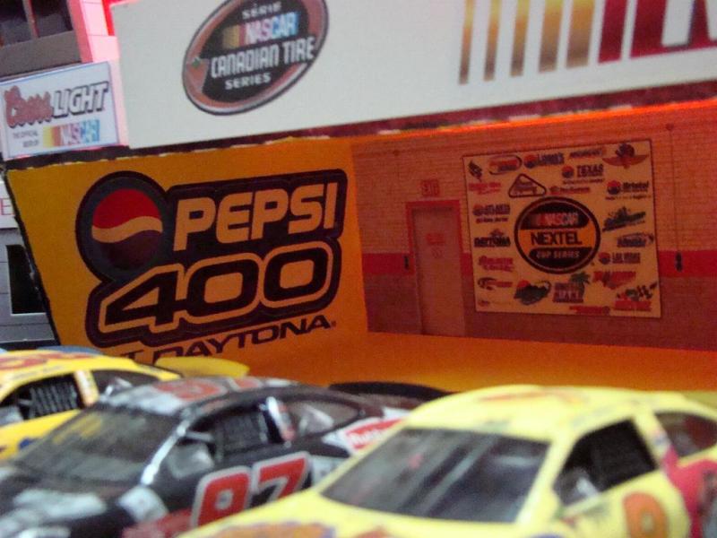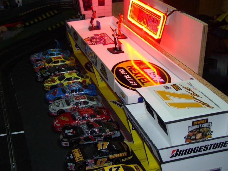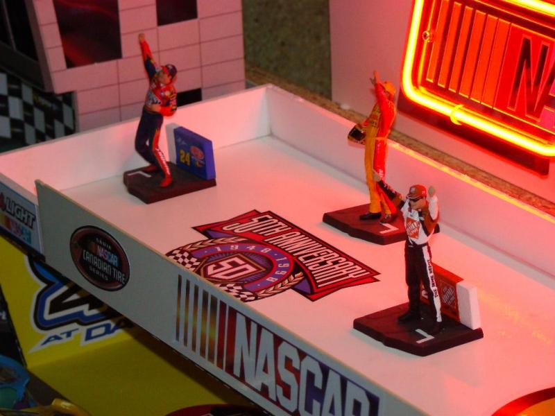 Voici un petit stand nascar avec trois statue sur le toit et un néon.