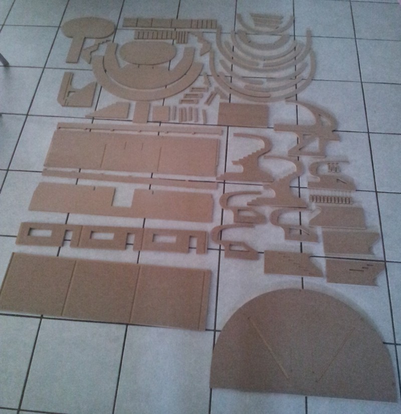 Oui en effet, mais beaucoup moins que pour dessiner l'ensemble en trois D, passer des dessins industriels au format pour la défonceuse numérique et la patience pour attendre que la défonceuse taille tranquillement chacune des 14O pièces!