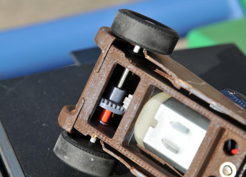 doté d'un moteur standard de chez Scalextric mais avec une couronne imprimée "maison"