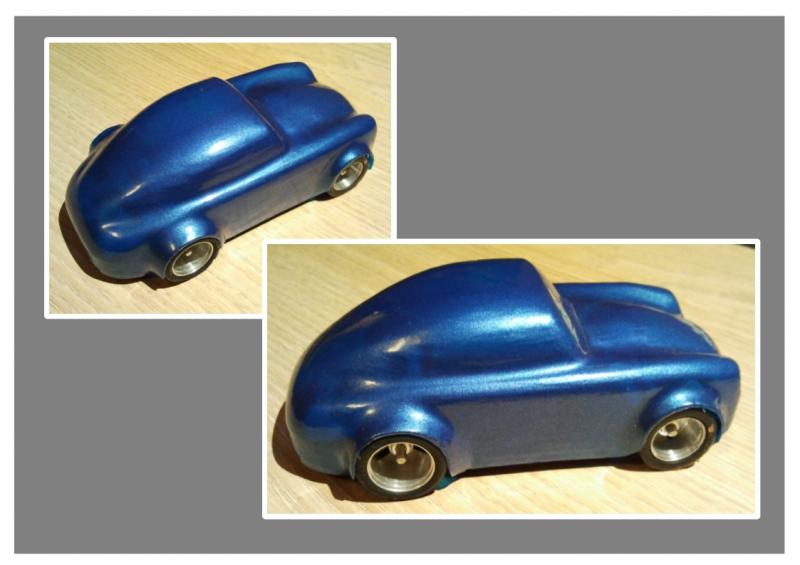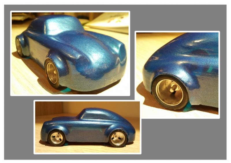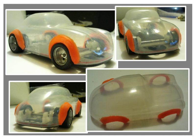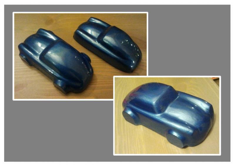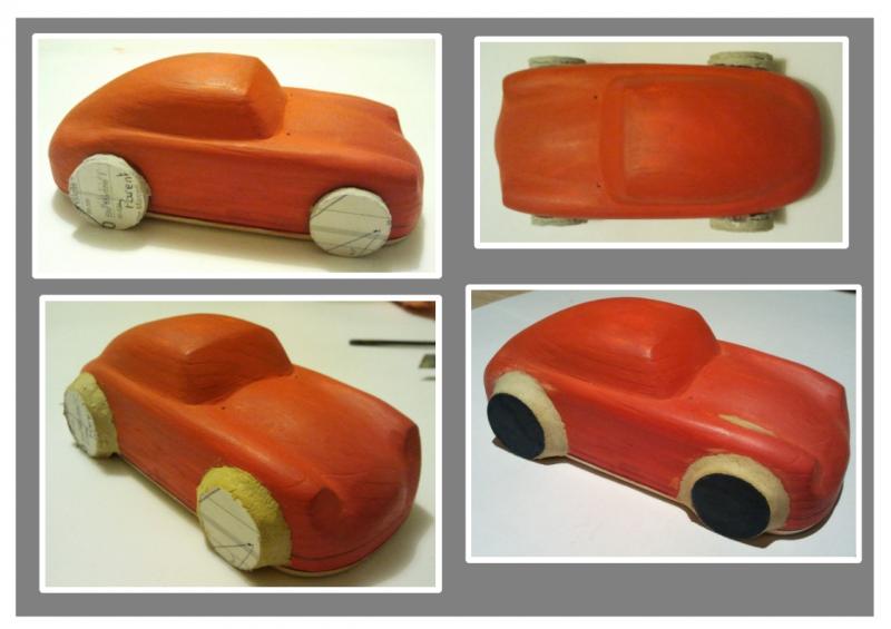 Ensuite préparation du moule, j'ai collé des fausses roues d'un diamètre supérieur au roue de la voiture. Et mise en forme à l'aide de pâte à bois.
