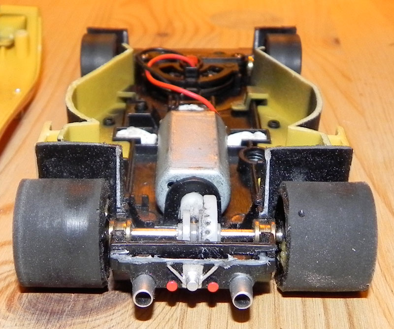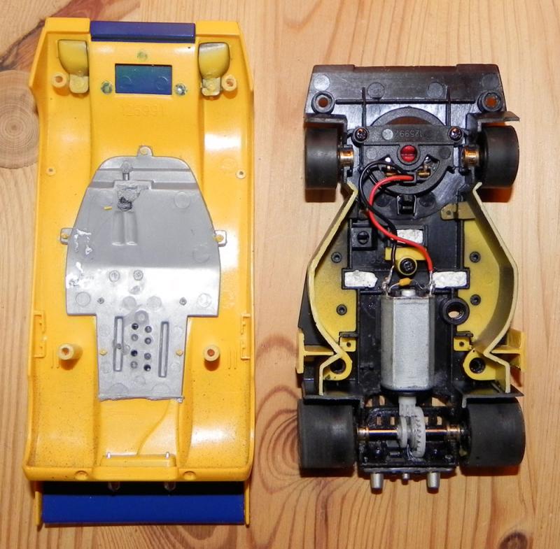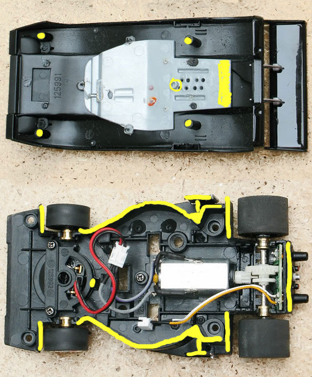 En gros j'ai enlever 2mm à chacune des parties en jaune (sans oublier le petit ergot du guide et la partie grise près de l'intérieur du moteur sous la carrosserie qui frotteraient tous deux dans les tournants et au roulage ).