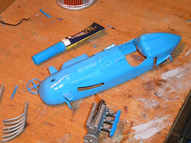 en attendant les pneus de bruno je m'occupe peinture du moteur et preparation de la caisse, enduit ponçage et couche d'apret