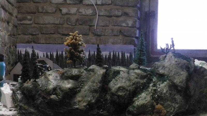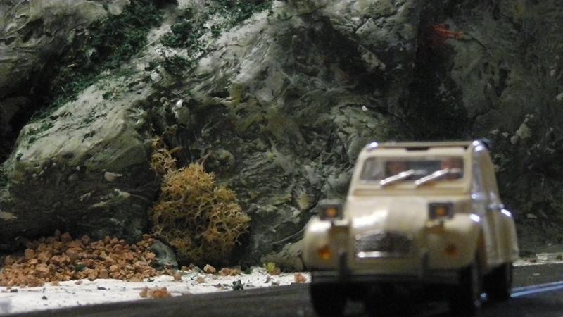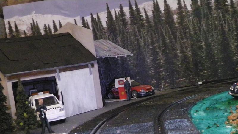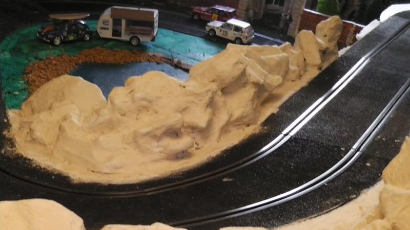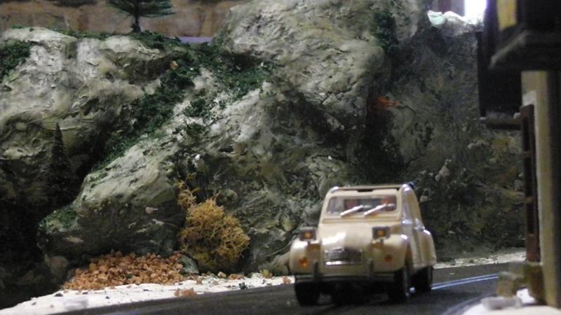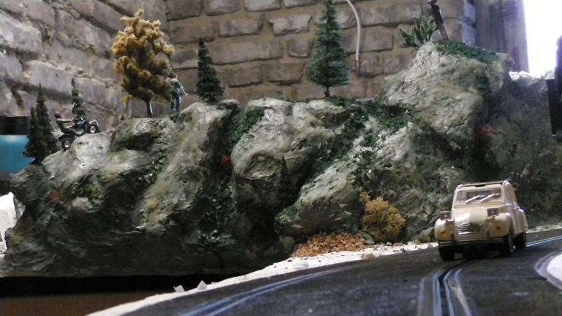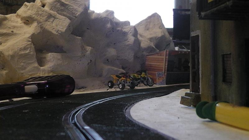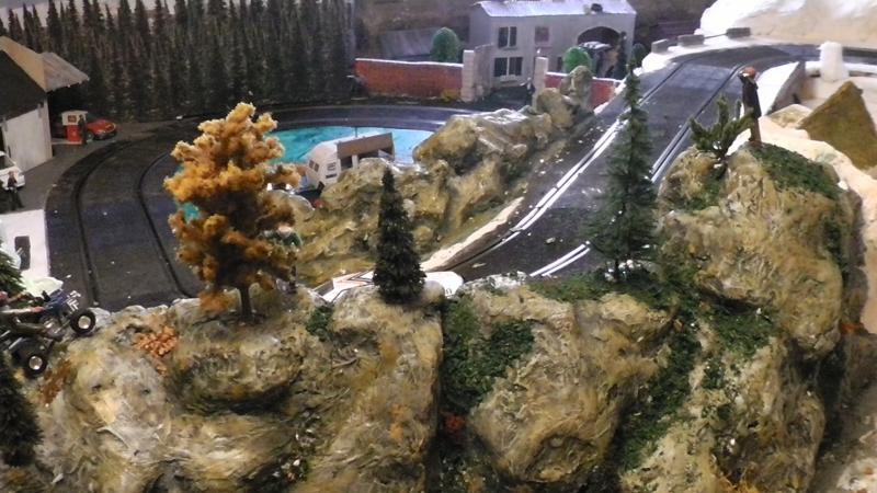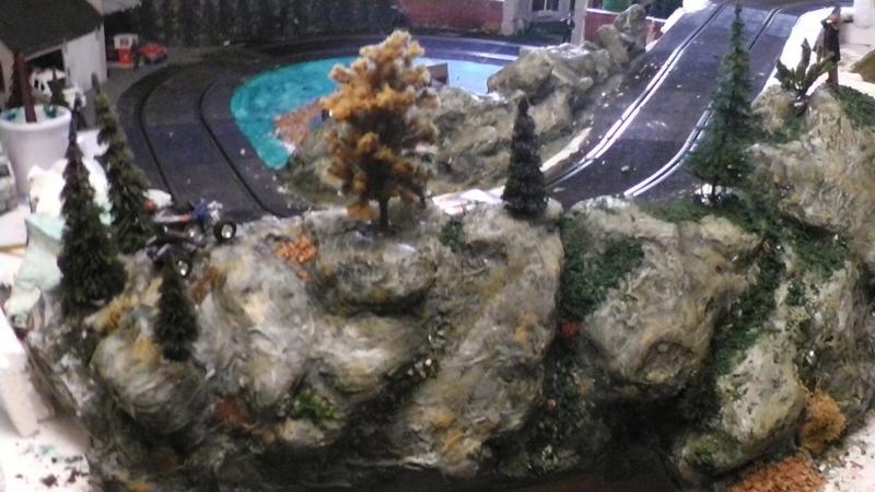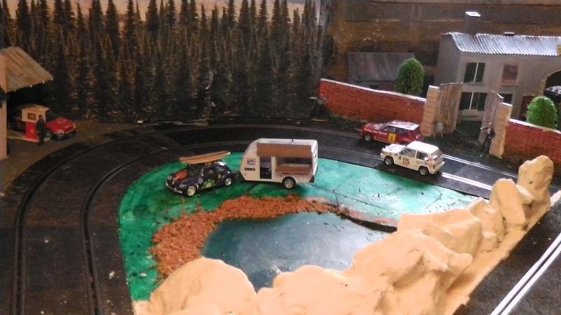 Une petite remarque: le bord de ton petit étang qui borde la piste est trop net, rajoutes un peu de roche et de végétation rase en trompe l' oeil au pinceau.