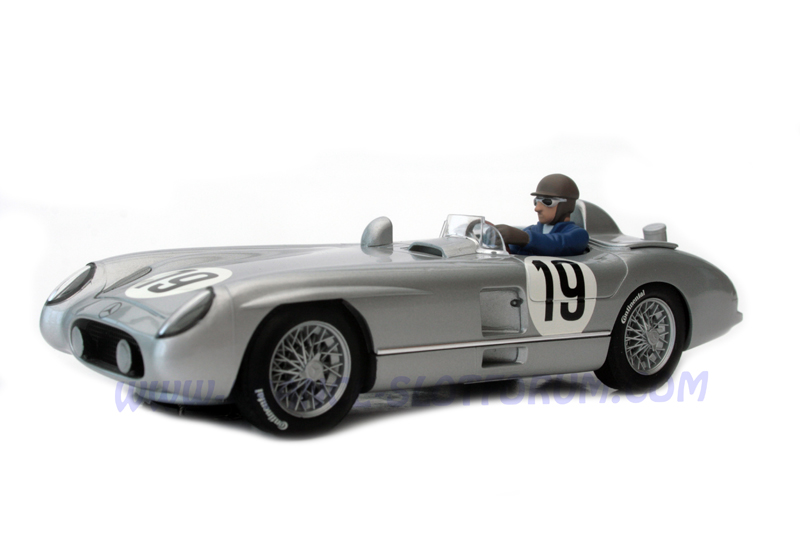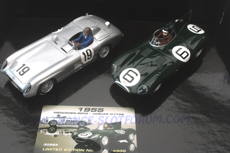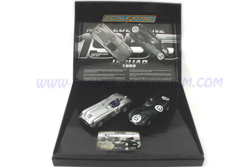 Scalextric nous présente une nouvelle fois un superbe coffret très originale. Il est composé de la Jaguar Type D pilotée par M.Hawthorn et I.Bueb qui remportera l'édition 1955 de ces 24h du mans tristement célèbre et de la MERCEDES-BENZ 300 SLR pilotée par l'équipage de rêve Fangio et Moss qui sera retirée de la piste dans les conditions que l'on connait.
