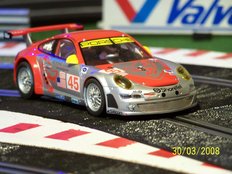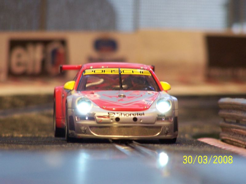 Auteur Message porche385 Date du message : jeudi 28 février 2008 à 22h53 Salut ça pourait être la solution car j'ai pu voir une chose il semblait qu'elle allait mieux suite à mes réglages mais au bout de 150 tours il baisse de puissance revenens ainsi à mes anciens kronos ben mince alors la solutions c'est le kit HRS slot-it et en mars ils sortent le nouveau HRS 2 ou le MB slot qui à l'air super tout les deux sortent en Mars Auteur Message porche385 Date du message : jeudi 28 février 2008 à 22h55 En faite la meme que mon avatar sauf que celle la c'est Racer Auteur Message coyote33 Date du message : dimanche 30 mars 2008 à 19h19 bon allez je remonte ce post, car je m'eternise un peu sur cette si belle auto qui me saoule a rester dans la vitrine. donc aujourd'hui bricole, grace au blog de FRANKY http://slotracingplanet.blogspot.com/ et leurs conseil de preparation, j'ai apliquer la methode pour passer en guide ninco. et bien ca change la vie, l'auto ne deslote quasiment plus, de plus le courant passe mieux et lez frein s'en rescend, ce n'est pas enorme mais ca freine un peu mieux, mais surtout l'auto est beaucoup plus agreable et enfin dans les temps de mes autres gt, j'ai egalemment pratique le limage du berceau moteur.
