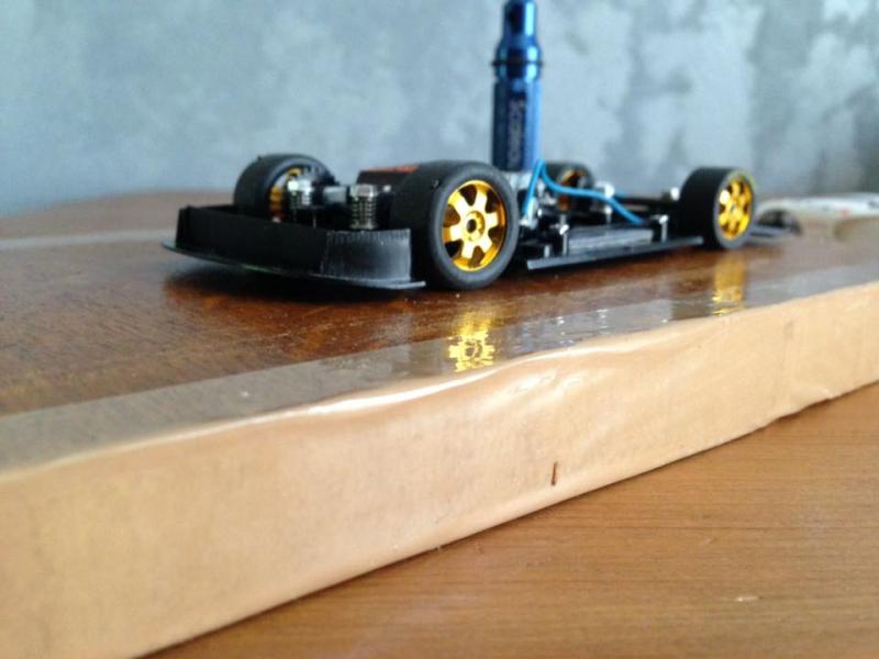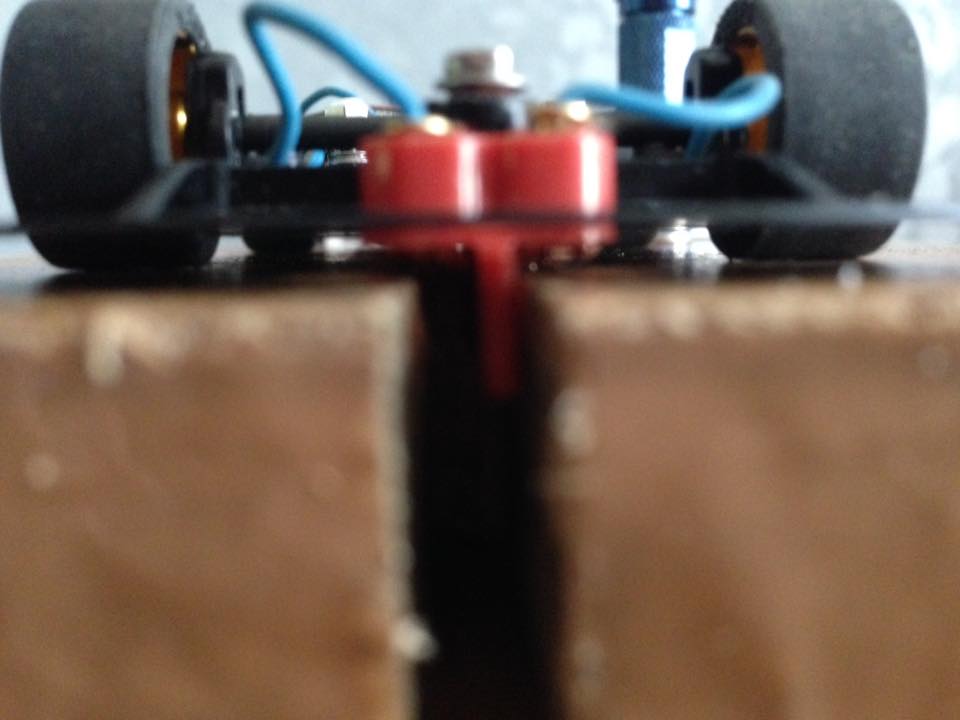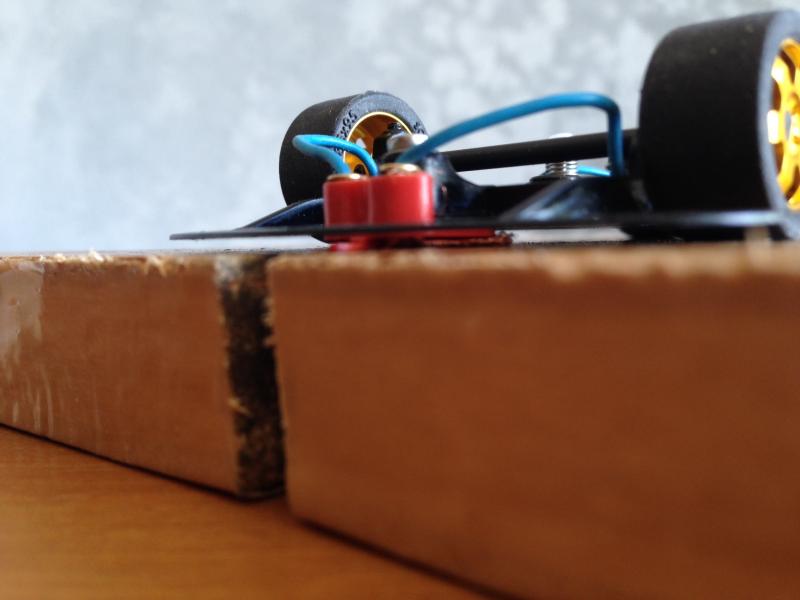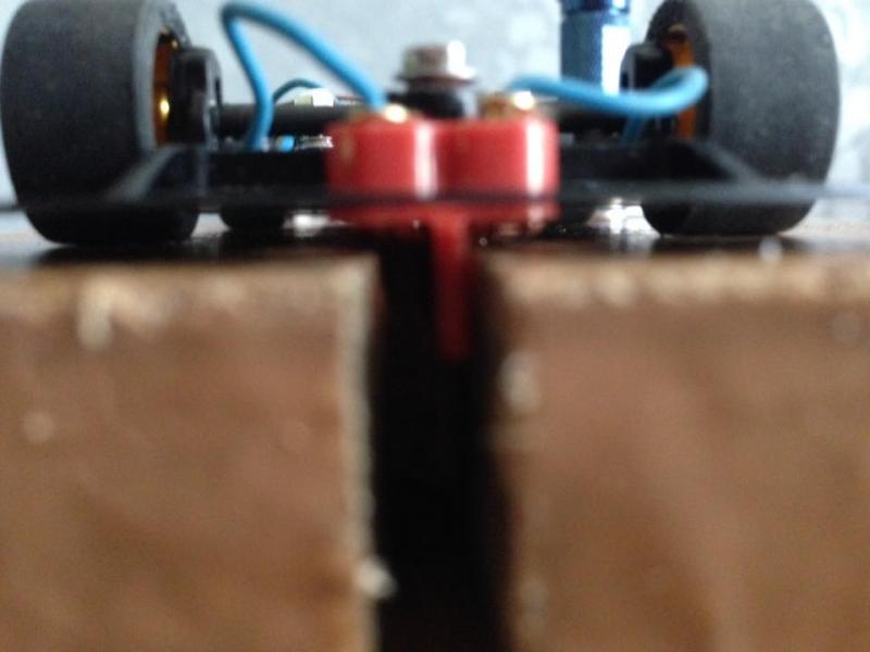 En fait, oui, les 4 roues doivent toucher la piste (même s'il y a différentes théories à cet égard), mais les roues avant doivent seulement l'effleurer, juste assez pour tourner lorsque la voiture avance. L'essentiel du poids doit reposer sur le guide.