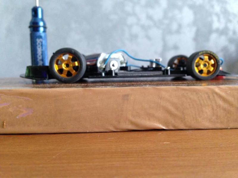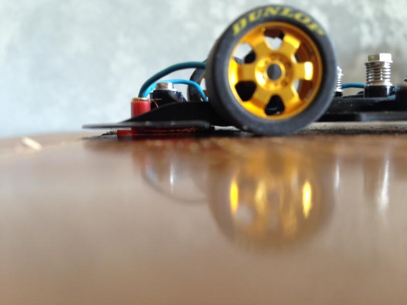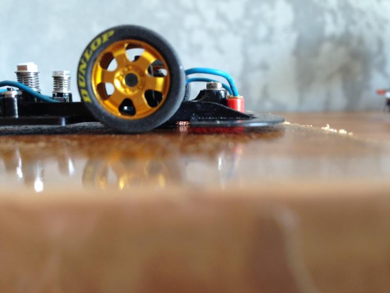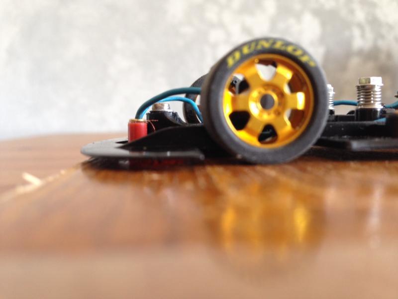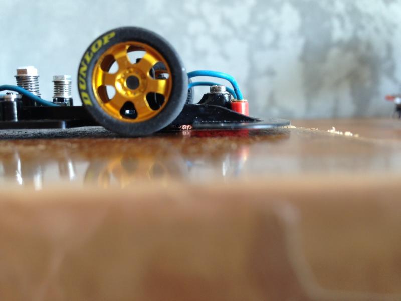 Si maintenant on accepte que les pneus AV ne touchent pas le sol, c'est pour moi le plus efficace en terme de performances. Les roues avant ne tournent pas en ligne droite, donc pas de pertes d'énergie et pas de soucis avec les irrégularités de la piste. Et dans les virages elles peuvent servir de stabilisateurs en étant sûr que la roue intérieure ne touchera pas la piste. D'ailleurs on peut aussi utiliser le châssis comme stabilisateur, ça marche très bien!