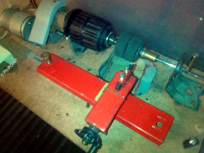 Donc l'outil de coupe (taillé dans un foret de 5 que tu n'as pas mais que tu peux remplacer par n'importe quel bout de ferraille...) entaille le pneu à la côte voulue que l'on règle avec le petit volant (récup d'une roue d'un jouet (faut que tu l'ajoutes dans ta liste)) à raison d'une avance d'1mm par tour...