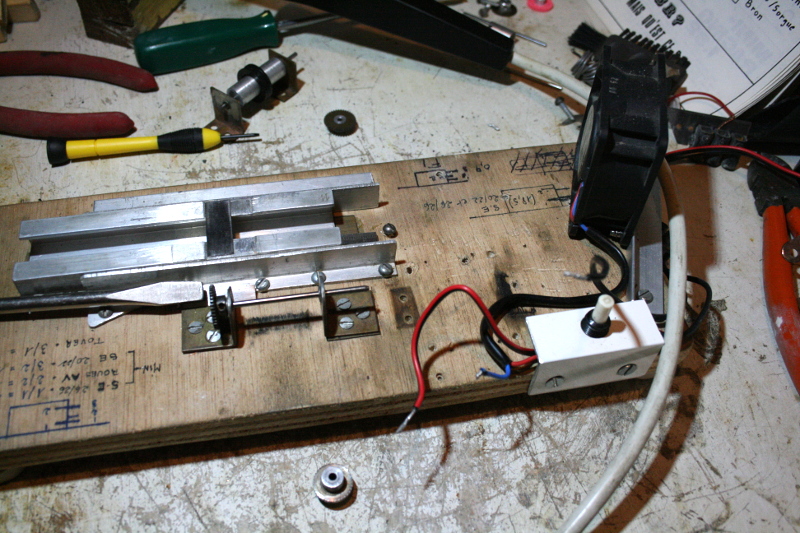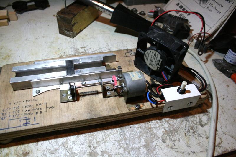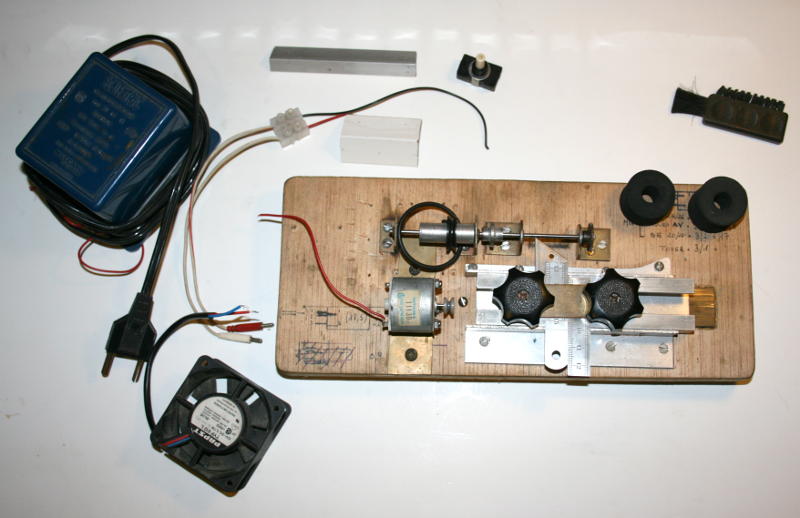A gauche un transfo Scalextric, un ventilateur d'ordinateur pour refroidir le moteur dont je ne me souviens plus la provenance.