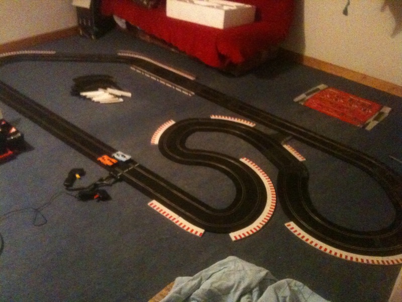 sinon j'ai monté cette " modeste " piste, je n'ai pas utilisé tous les rails ( il me reste des courbes) et déjà il y a quelques choses qui ne me vont pas.