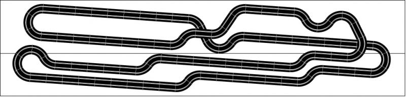 BRUNO a écrit :J'ai dessiné vite fait le circuit suivant en Ninco en évitant de superposer les virages. Les 2 voies sont de longueur égale, à 50,88m. J'ai juste utilisé quelques courbes R4 au milieu pour indiquer la présence d'un virage à grande vitesse, à réaliser comme tu peux. C'est juste une première idée, je n'ai pas essayé d'optimiser quoi que ce soit.Je n'avais pas imaginé que les parties en virage repasseraient au dessus d'un virage précédent , je ne sais pas ce que cela donnerait au niveau des supports , par contre j' avais imaginé deux lignes droites l'une au dessus de l'autre coté montée et coté descente
