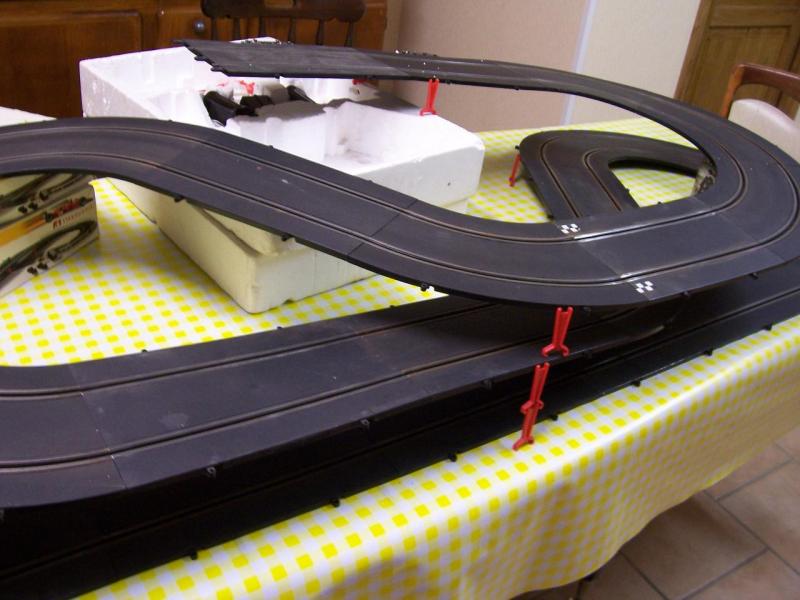 Pour facilité l'accès à toutes les parties en virages de circuits, je les ai regroupées à l'extérieur et au centre, ou je peut accéder par un grand évidement , la grande ligne droite serait assez basse , environ 60 cm du sol pour pouvoir enjanber facilement pour aller remettre une voiture qui serait sortie.