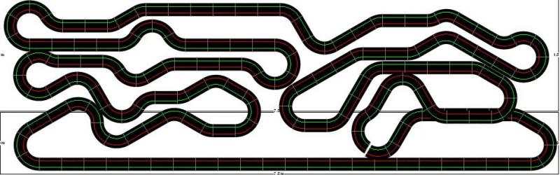 J'ai envisagé et imaginé une piste type rallye en montagne, il y aurait très peu de partie à plat environ 1/4 du tracé , le reste serait comme une route a flanc de montagne sur un support oblique , il y aurait une montée en lacet court , puis le passage d'un col, et une descente en lacet plus long pour avoir moins de pente