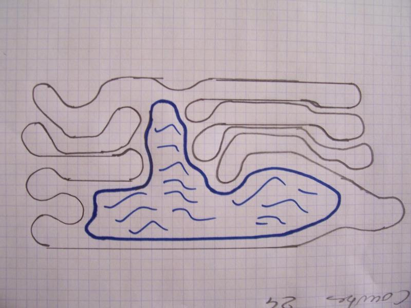 Puis j'ai esseyé de maquetter tout cela , j'arrive à un devellopé de 56 m , j'ai évité d'avoir des rails à recouper, le parraléllisme des lignes droites qui est habituellement un défaut sur les circuits habituels, ne me parrait pas génant ici puisque l'on est en terrasse