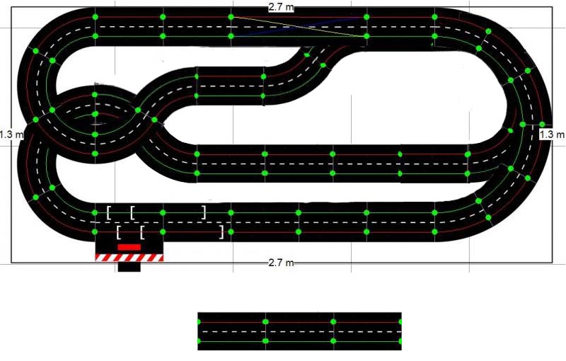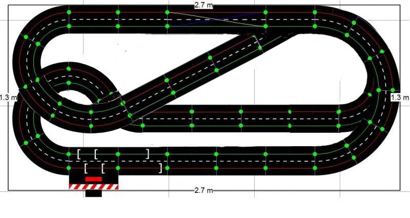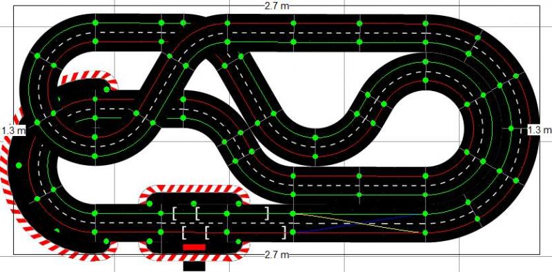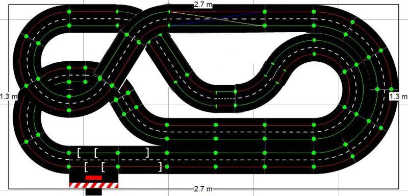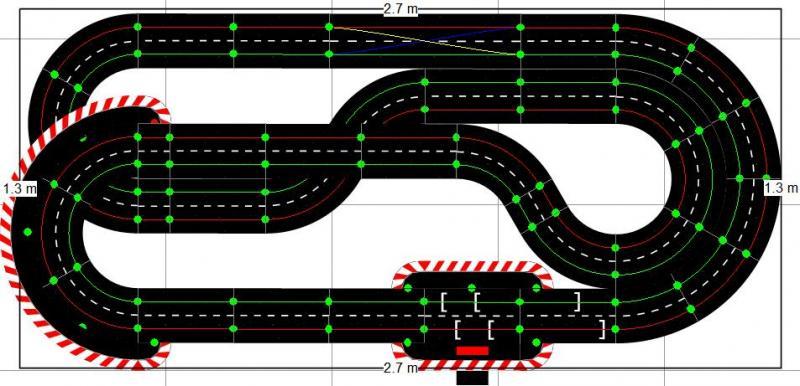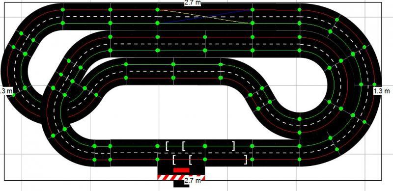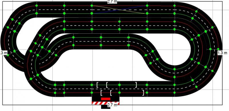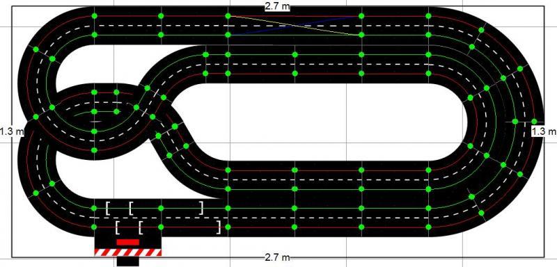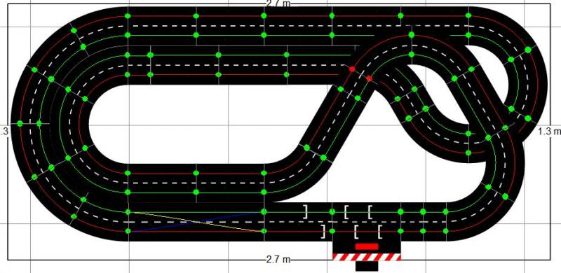 Voici le tracé que j'envisage de faire, en Carrera 132, compte-tenu de mon relativement faible espace. Il est posé sur 2x5 tables IKEA Lack, soit 275cm de large, et environ 130cm de profondeur.