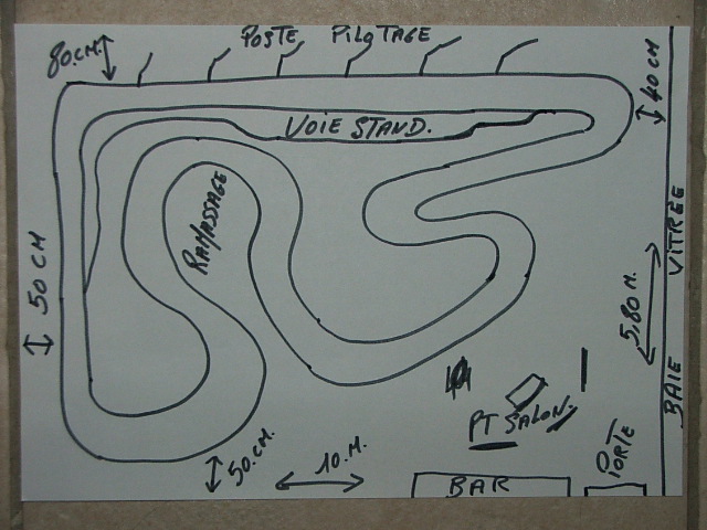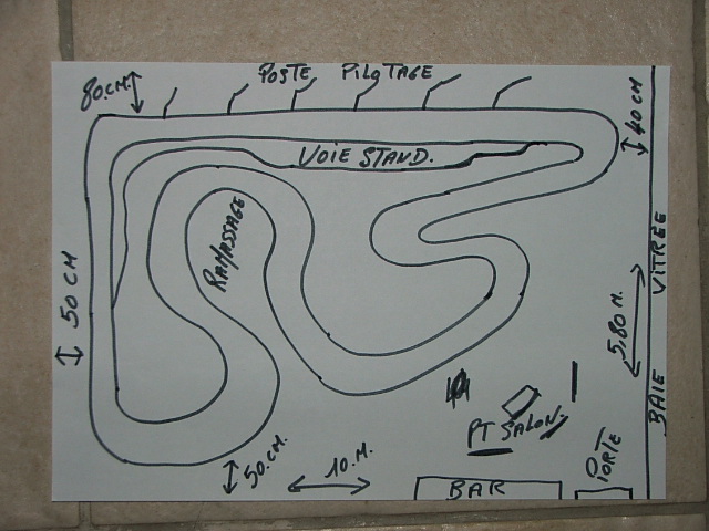 bon soir au vu du tracé la piste interieur sera plus court (au moins 50cm) . je suis d'accord rien de plus realiste qu'un circuit qui a exister .mais avec les dimensions que tu as. il y a de quoi faire pas mal ,une boucle(longue ou court) permet d'equilibrer les 2 pistes .pour qu'un circuit ne lasse pas il faut une partie rapide et une voire 2 partie technique .si tu en mets 2 ,entre tu peux remettre une partie de reprise rapide. juste mon point de vu. Message modifié le mercredi 23 juillet 2008 à 19h44 par fs83 Auteur Message Date du message : mercredi 23 juillet 2008 à 19h20