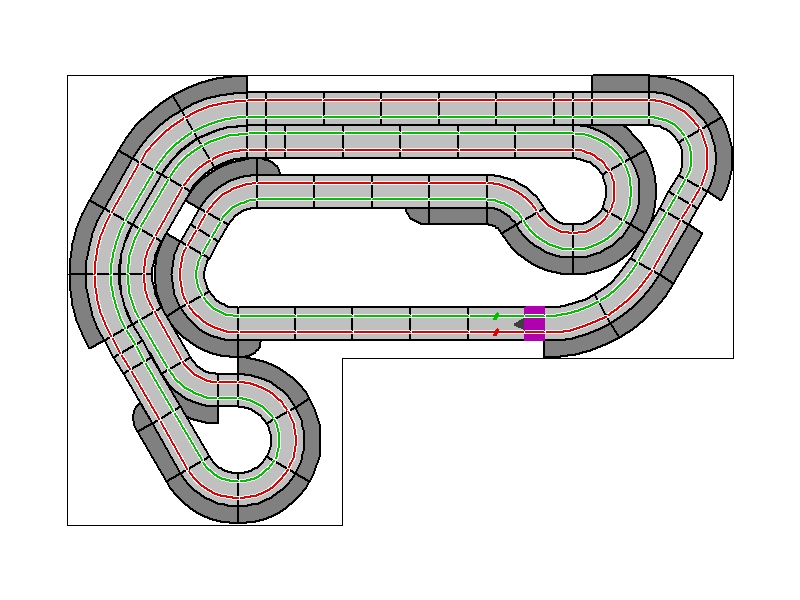 Je trouve que cela a de la gueule. Ca fait "faux" 4 pistes. J'aime beaucoup en analogique pour gagner de la place et des bordures mais attention au colision en digitale : une autre voiture pouvant venir sur le slot vert en sens inverse sur la piste d'à coté