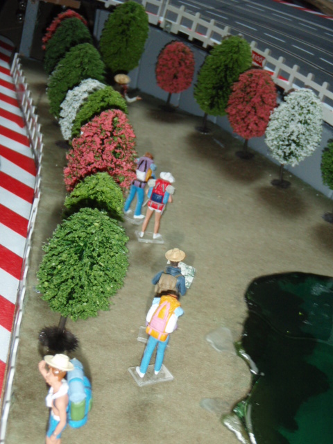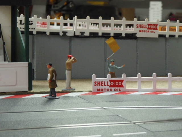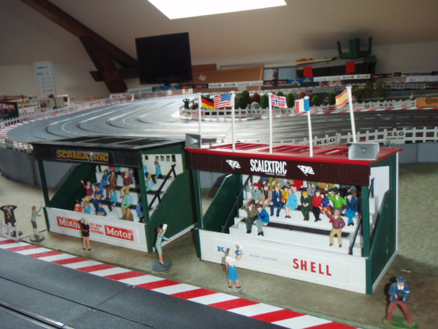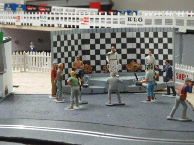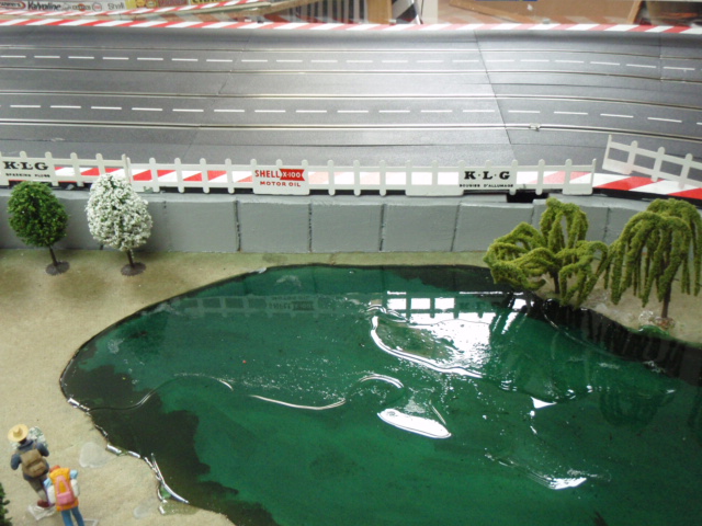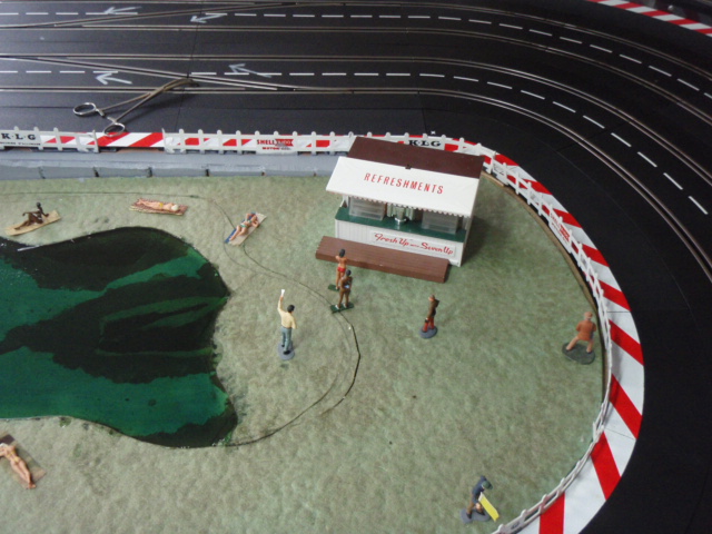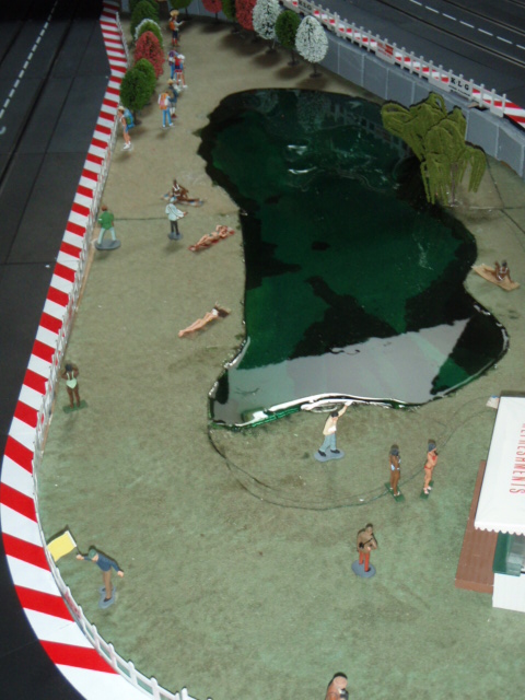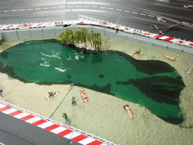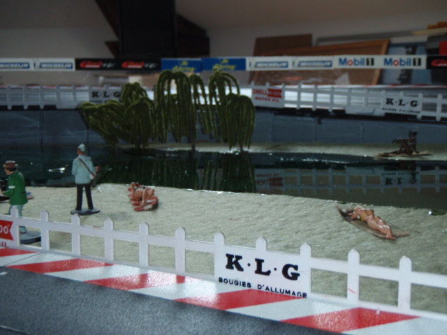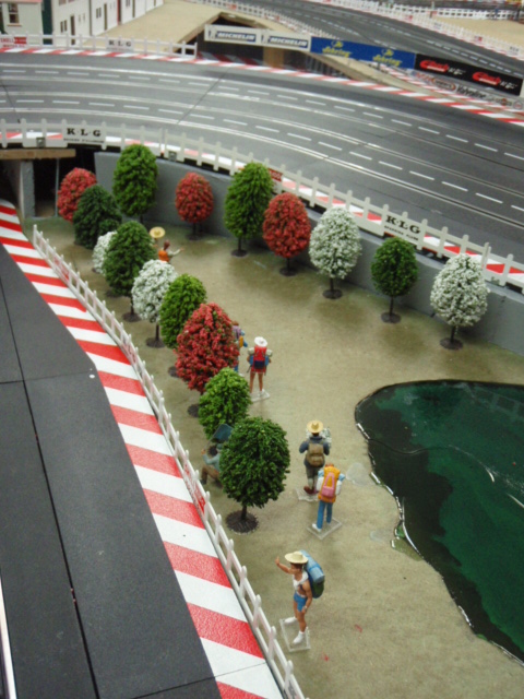 Pour avoir un effet d'herbes et surtout permettre aux personnages de tenir facilement sur le support, j'ai utilisé des dalles vertes pour sous couche de parquet. J'ai trouvé des dalles épaisses et surtout peu friable. L'inconvénient de ces dalles c'est la poussière qu'elle génère. Pour la limiter au maximum j'ai tout vernis, résultat après 3 mois c'est nickel. Les différents personnages commencent à trouver leurs places autour du circuit, spectateurs, photographes, commissaires de pistes ....