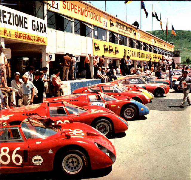 comme on peut le voir sur cette photo, à l'époque de ce type de stands, il n'y avait pas de "pit lane" comme on la connait aujourd'hui avec un muret qui sépare la piste de la voie des stands.