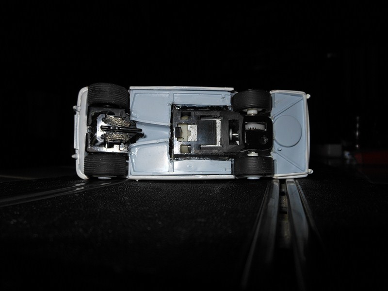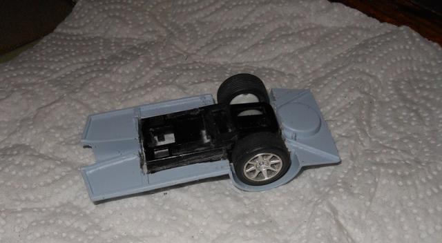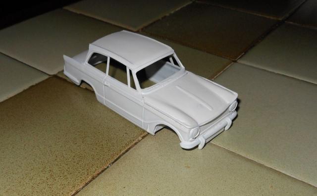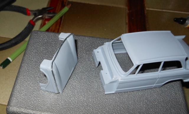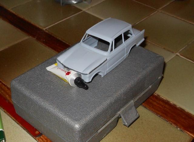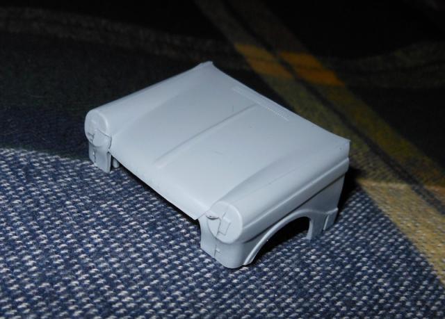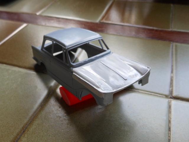 Petit avancement avec une couche légère de peinture pour faire ressortir les défauts et pose du bossage central de capot en carton de carte de visite.