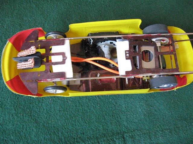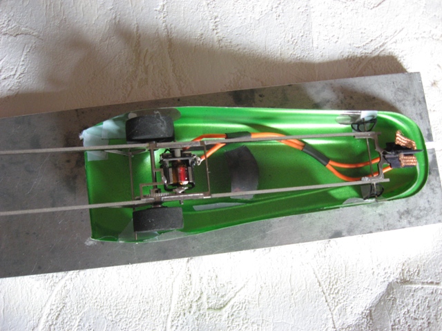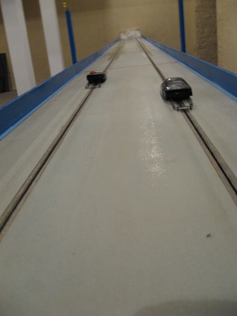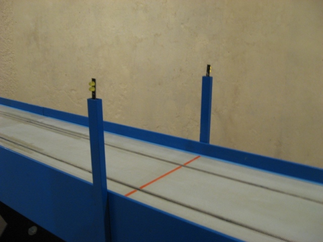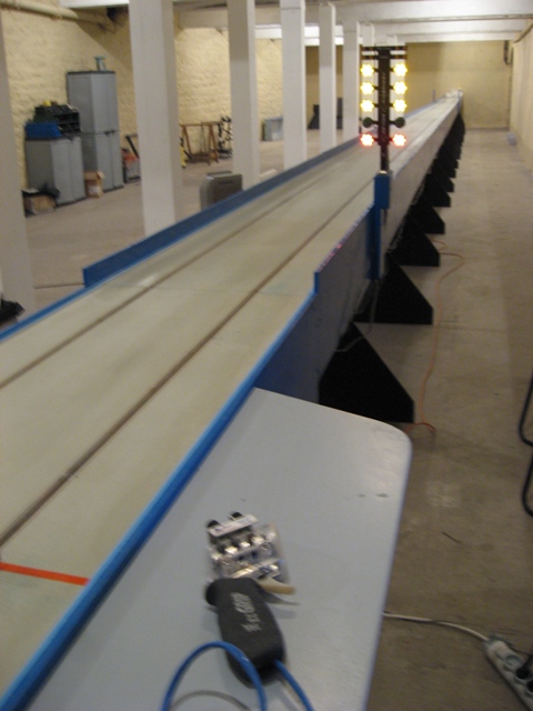 La bête fait 9 segments de 2.80m car il était prévu de pouvoir la démonter régulièrement, la surface de course est en médium de 25mm, les renforts latéraux et les pieds en contreplaqué de 12mm peint, la tresse est allemande, chaque longueur de tresse est doublée d'un cable de 25mm², l'alimentation comprend pour chaque voie un transfo Bulldog de 16.2v / 80a couplé à une capa de 3.5 farad l'ensemble fait un ampérage illimité à l'impultion.