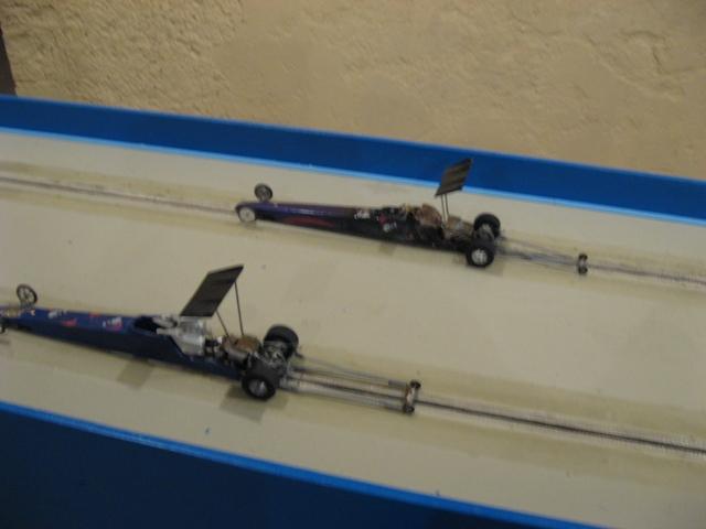 La zône de départ avec l'écran, l'imprimante, les tablettes de chaque côté pour que chaque pilote puisse préparer sa voiture, et 2 Top Fuel Dragsters sur la ligne de départ :