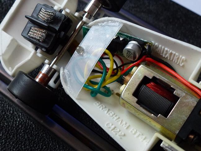 J’ai remonté le moteur, et collé le microprocesseur a l’intérieur gauche de l’auto à l’aide du double face (provisoire qui pourrait durer longtemps, mais le mieux serait une goutte de silicone), puis remettre l’élément guide.