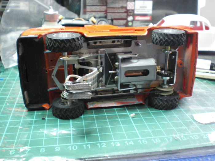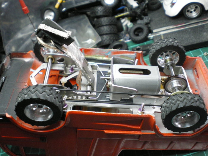 Pfiouu, pas facile à dire je connais surtout le plafit en fait on dirait bien du fait maison, mais l'avant fait penser à un châssis MSC et la fixation moteur on dirait un porte axe avant.L'est balèze le gars.