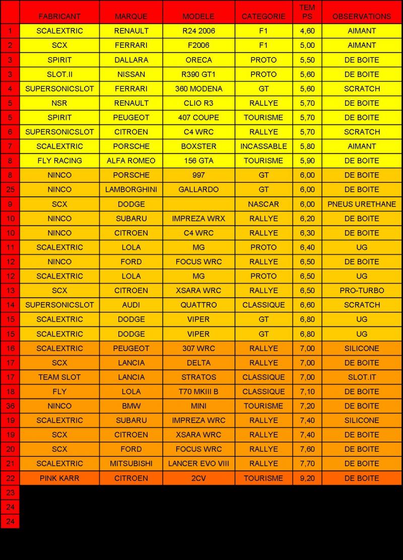 Je fais remonter ce post : je prépare une nouvelle liste de temps, avec de nouvelles autos (Alfa 33, R8, GT40 Scalex, 250 GTO, .....) et surtout avec ma piste modifiée!