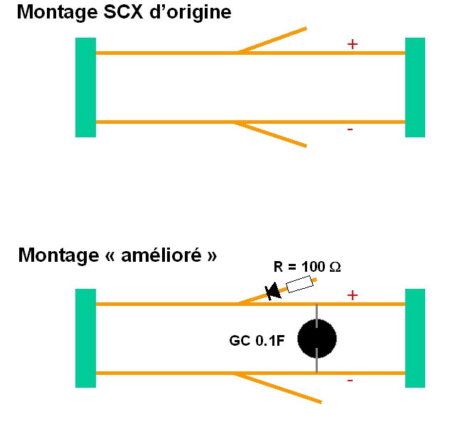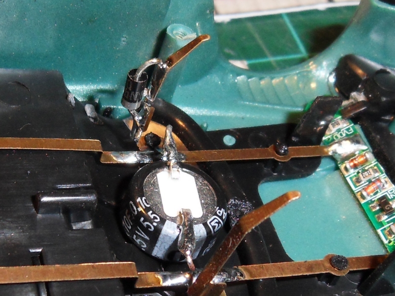 - un condensateur "Gold Cap" 5.5 volt 0.1 F en parrallèle sur les pistes en cuivre de l'habitacle
