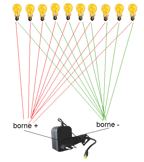 Je n'ai pas envie de mettre en place une installation en série afin de ne pas être confronté au problème d'une ampoule qui grille et qui entraîne l'extinction de tout le réseau (sans compter surtout qu'il faut ensuite arriver à identifier l'ampoule grillée...)