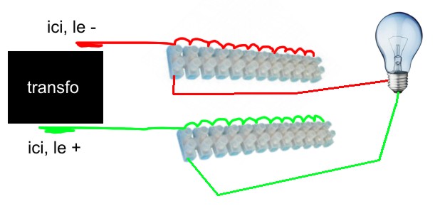 | zined a écrit : | | faut-il 2 fils électriques par lampadaire ; donc si on a 20 lampadaires on se retrouve avec 40 fils ; mais comment ces 40 fils sont-ils reliés au transformateur 12 volt ?