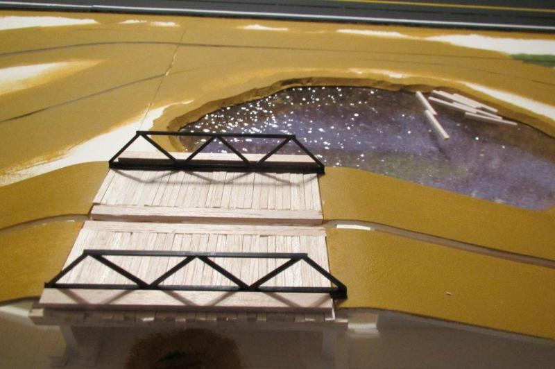 Bon, la déco est loin d'être terminée (surtout le %$@£&! de pont...), mais ça avance tout doucement. Une partie des arbres a été plantée de façon provisoire (non collés) pour vérifier que ça passe...