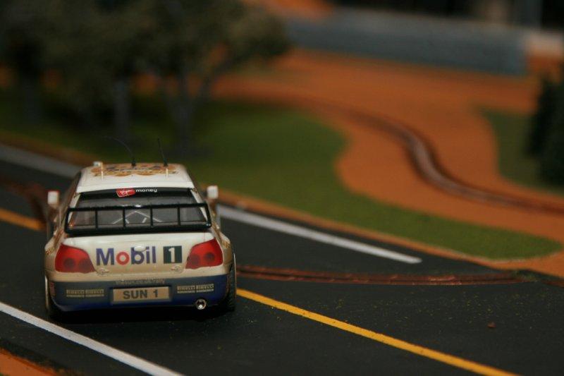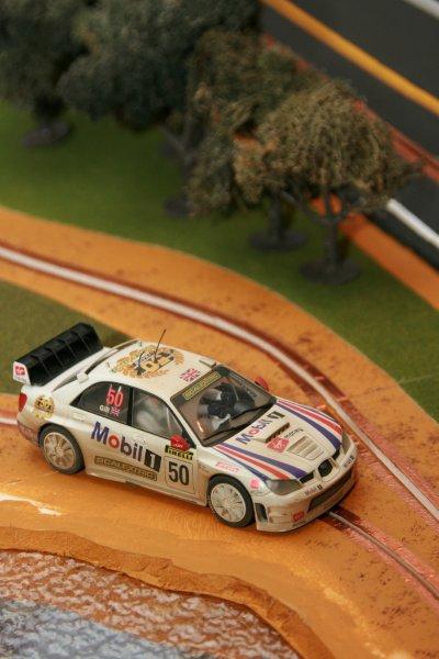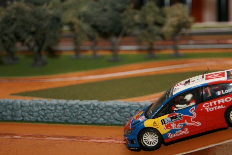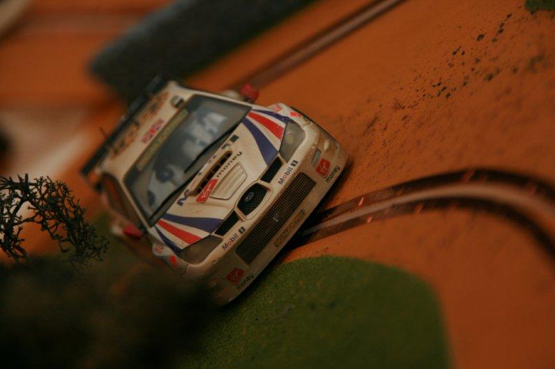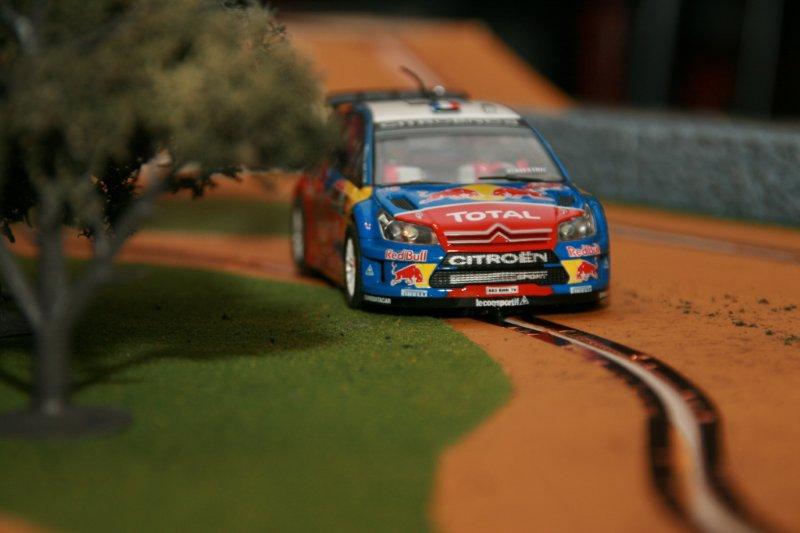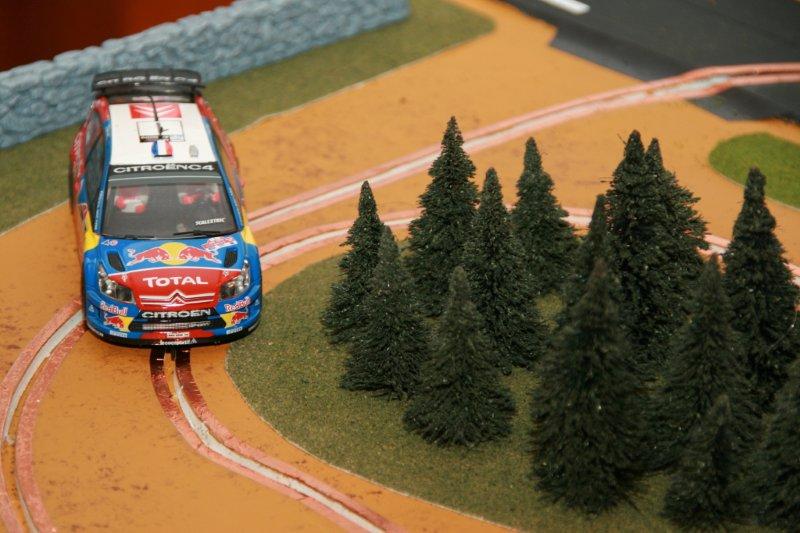 Après essais, toutes mes voitures de rallye passent sans encombre, à part peut-être la DS du Monte-Carlo 61 (SCX), à cause de sa longueur et du poids tout à l'arrière (un comble pour une DS!). Tenue de route impeccable, que ce soit les 4x2 ou les 4x4, et toutes en pneus d'origine. Ça pourrait même glisser plus que ce serait le fun, mais je manque de vitesse car la piste est très courte.