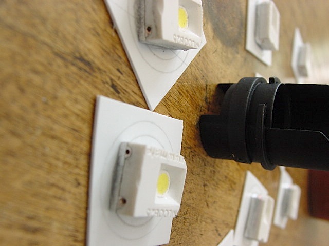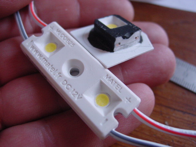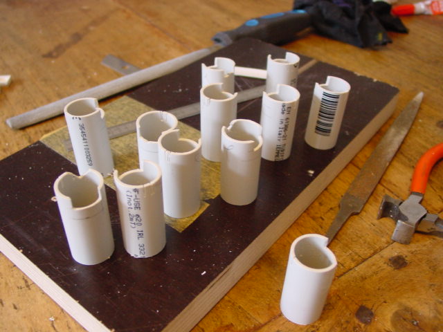 Ayant enfin trouvé le moyen de séparer les leds en deux et de les diminuer au maximum sans les "cour-circuiter" et surtout trouver le moyen de se repiquer dessus, j'ai pu m'attaquer à ce bout de chute de tuyaux pour qu'il ressemble pour essayer d'être un beau projecteur orientable