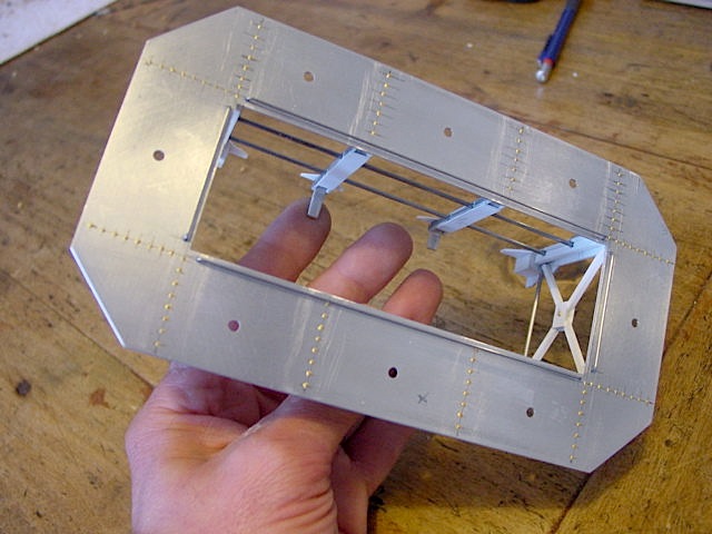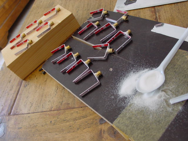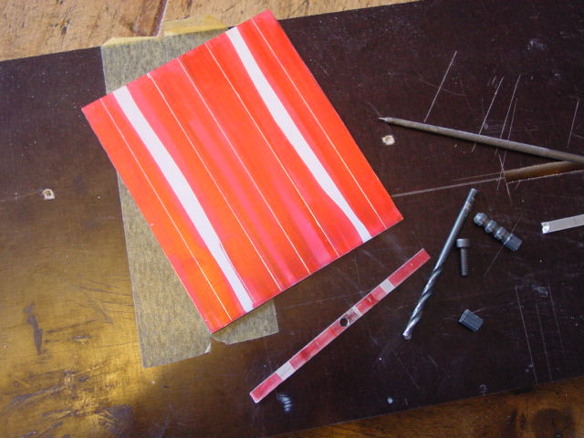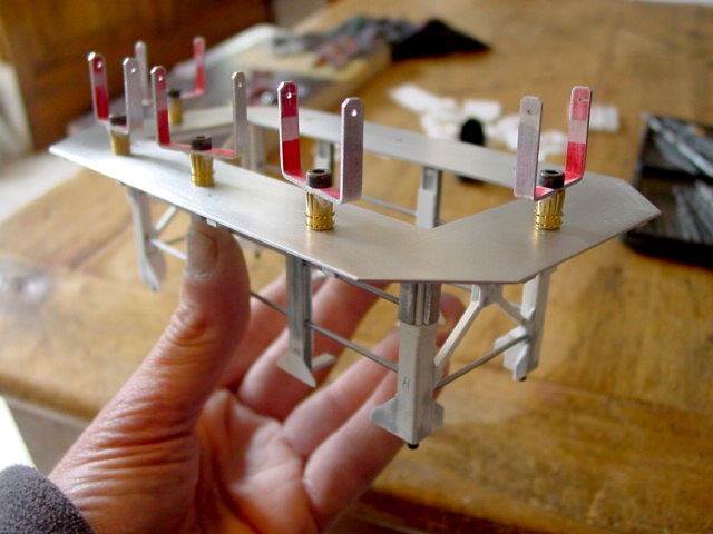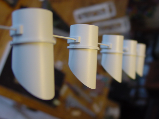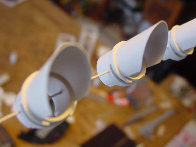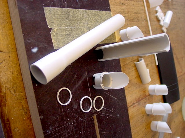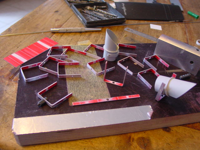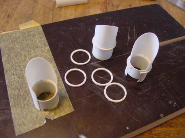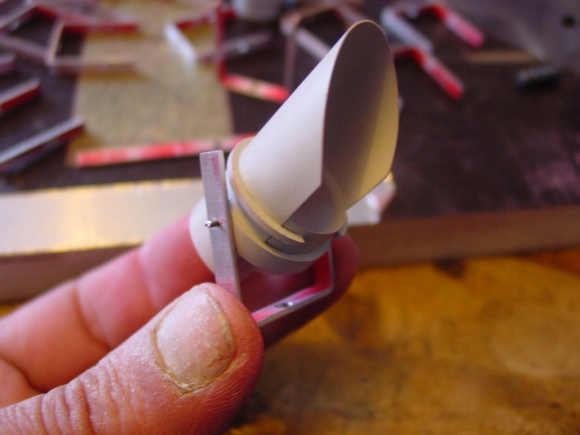Un calibre de coupe de la "visière" . Le tuyaux plus court, encoche pour le passage de la led, chanfrein à la sortie et collage en deux fois sur l'axe.