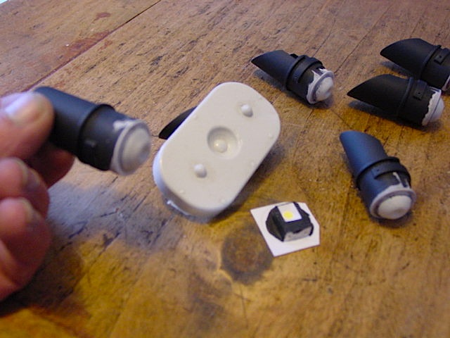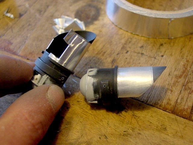 Pour donner du volume. Toujours dans la "récup" chute de pièces thermoformées. Découpage, collage au "cul" du projo, rattrapage, apprêt, rivets.